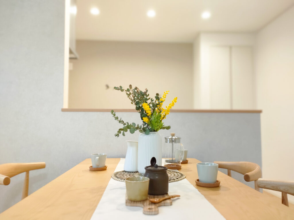 コンセプトを「暮らしが軽やかにひらく家」とし、家具や小物は主張しすぎず、空間の広がりや視線の抜けを大切にすること、カラーは春らしいイエローをアクセントとし、空間も気持ちも自然にひらいてゆく。忙しい毎日の中でも、心と時間に余白を持って暮らせる住まいをお客様がイメージできるように考えました。